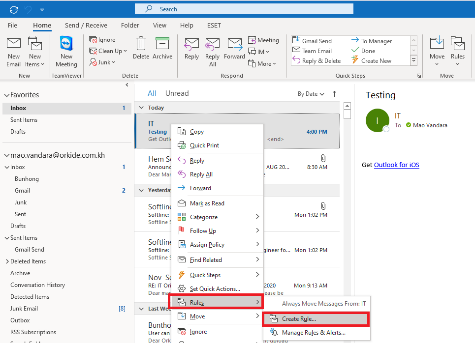 1. Right-click a message in your inbox or another email folder and select Rules.