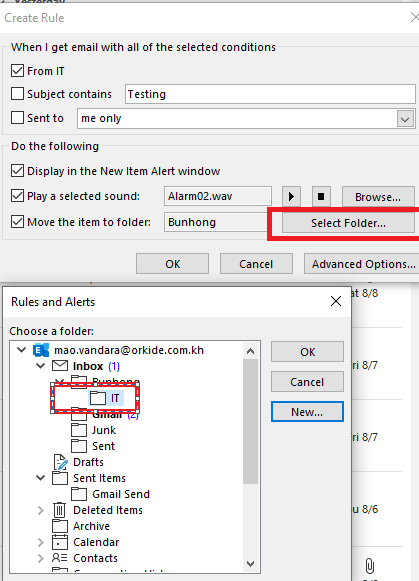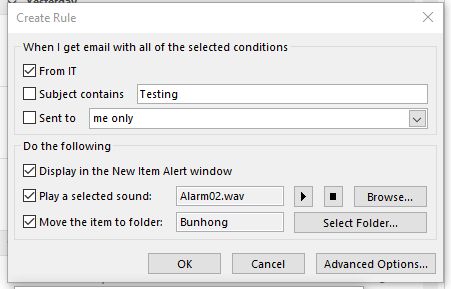 4. In the Do the following section, if you want the rule to move a message to a folder, check the Move item to folder box, then select the folder from the Select Folder dialog that pops up, and then click OK.