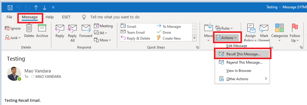 Message recall is available after you click Send and is available only if both you and the recipient have a Microsoft 365 or Microsoft Exchange email account in the same organization.